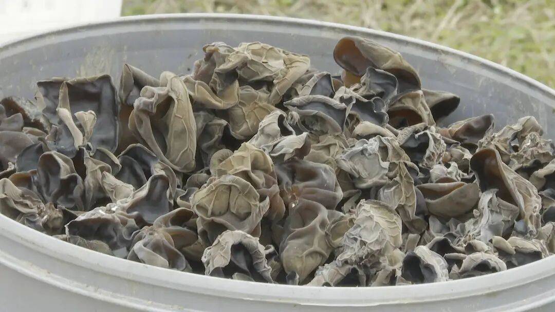 我们种了约40万棒木耳,每棒每年能产2两的干货,有黑天农二号、三号、十五号、普三等几个品种,搭配种植让产量更均匀。今年第一批木耳价格达到31元/斤,产值200多万。