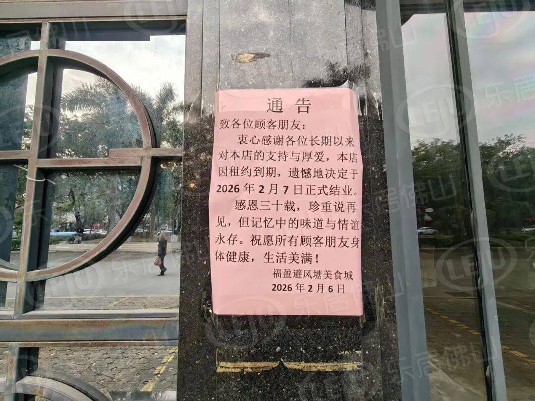 大门和侧门都清晰贴有福盈避风塘美食城发出的通告,提到“本店因租约到期,遗憾地决定于2026年2月7日正式结业”。