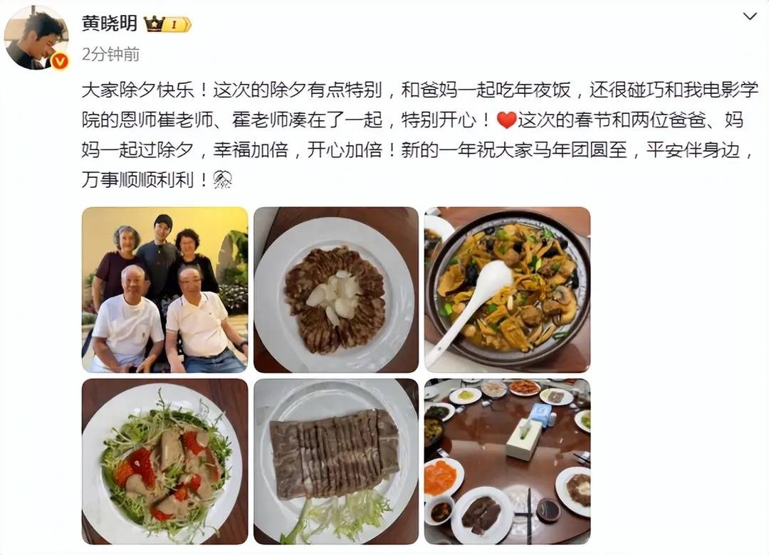 作为实力派演员和歌手,黄晓明的代表作《中国合伙人》《烈火英雄》等深入人心,他的一举一动也备受关注。今年春节,黄晓明选择前往海南陪伴父母过年,晒出的年夜饭也主打 “简约团圆风”。